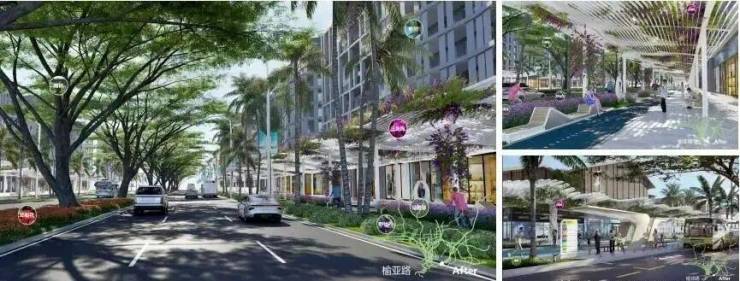 以植物藤架覆盖非机动车道和人行道,植物选用色彩明媚富有热带特色的花果,配合座椅等城市家具打造独具特色的街道空间。走走停停,赏花观果,遮挡烈日的同时又有趣味性和标志性。