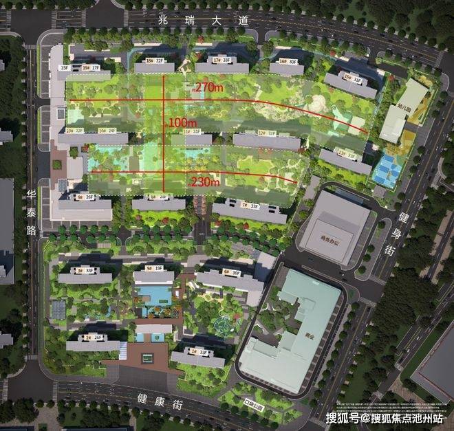 · 全整齐排布围合式布局, 最大超百米楼距