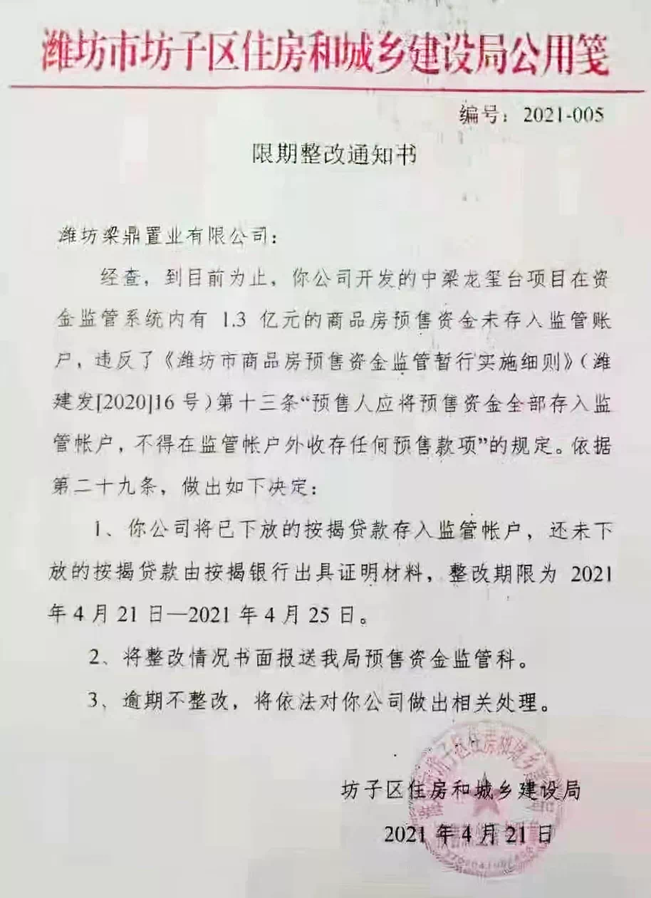 4月21日,潍坊市坊子区住房和城乡建设局向该项目下达了《限期整改通知书》,要求4月25日前将已经下放的按揭贷款存入监管账户,还未下放的按揭贷款由按揭银行出具证明材料。同时,将整改情况书面报送坊子区住房和城乡建设局预售资金监管科。