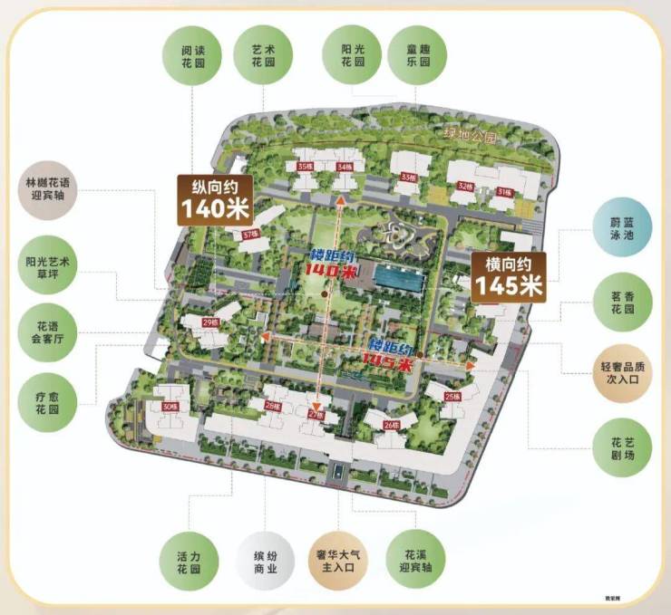 约10万㎡社区绿色园林,超百米阳光楼距,超阔央景园林一览无遗。