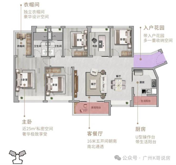 【140㎡5房2厅2卫】南北对流,约32m²阔绰客餐厅,约16米南向五开间,享央景园林约25m²豪华主卧,带独立衣帽间。