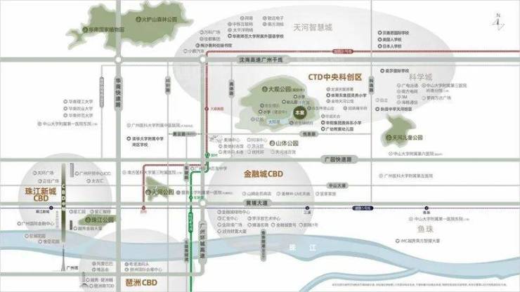 三面环山,片区及周边拥有丰富的山水资源,是天河东部重要的绿色开敞空间,水系包括太阳湖和月亮湖等2个人工湖,周边被钟岭、横岭、大山等自然山体环绕。