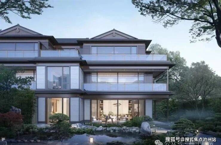 住宅立面设计延续了宋式建筑水平、简洁、飘逸的审美精髓,私人庭院内采用传统园林“堆山、叠石、理水”的造园手法,并以建筑、灌木、小桥和流水,构建起高、中、低三个层次的景致。