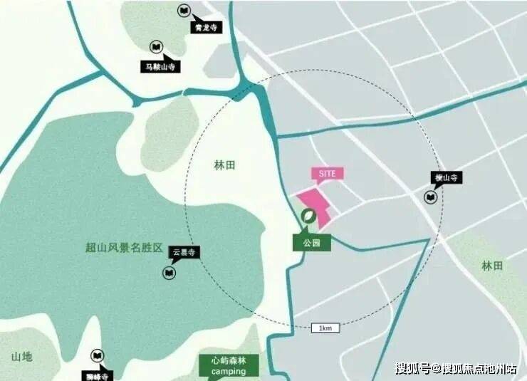 整体布局以中央山水景观轴为骨架,将松石叠泉和山水林间两大景观要素贯穿全区。营造“一轴一带八景十巷”的多进式园林体验。第一策略是充分利用自然景观的优势,运用中国传统园林设计中的“借景”手法,将超山和基地西侧的城市公园风景引入居住区。
