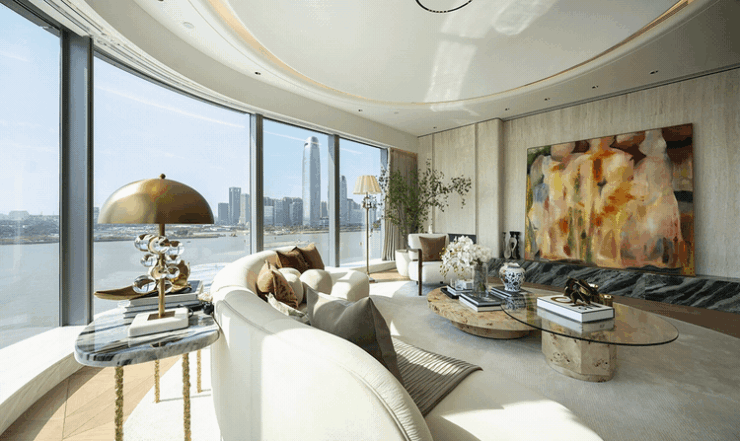 • 细节较真到离谱:弧形墙面不用拼接工艺,直接整块意大利洞石切割;实木地板要进实验室做7天7夜温湿循环测试,就为了适应江畔环境;电视背景墙用普拉达绿奢石,卫生间铺香格里拉翡翠、米兰红奢石,嘉格纳电器、德国雅生龙头、土耳其巴斯蒂姆五金,全是行业顶尖品牌;