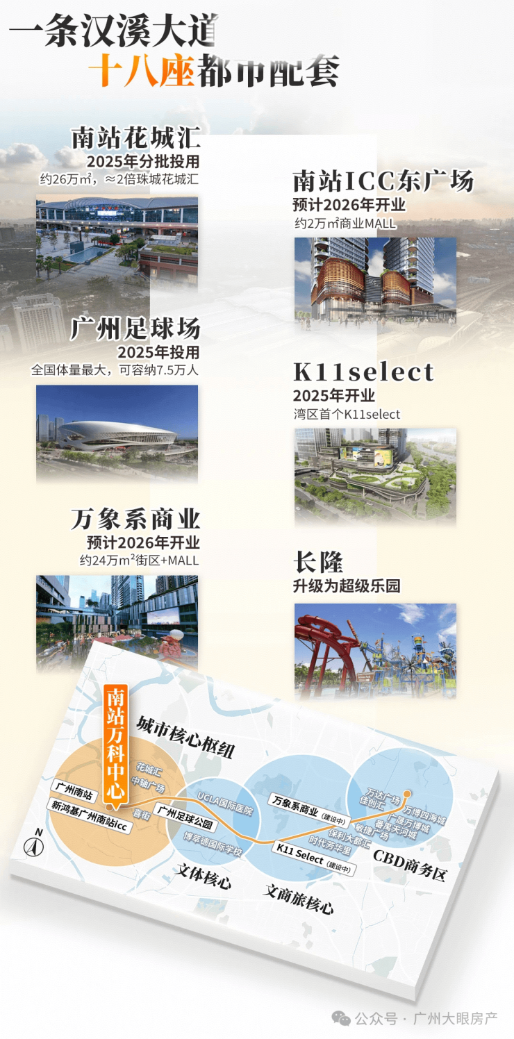 南站ICC、花城汇、喜街、K11select、万象系,密如蛛网的地标商业,带来世界级地标商圈配置,出门就是逛不完的高端商业。 从南站到足球场,再到长隆万博,一站式的枢纽、文体文旅、商圈等资源紧密咬合,自由流动。