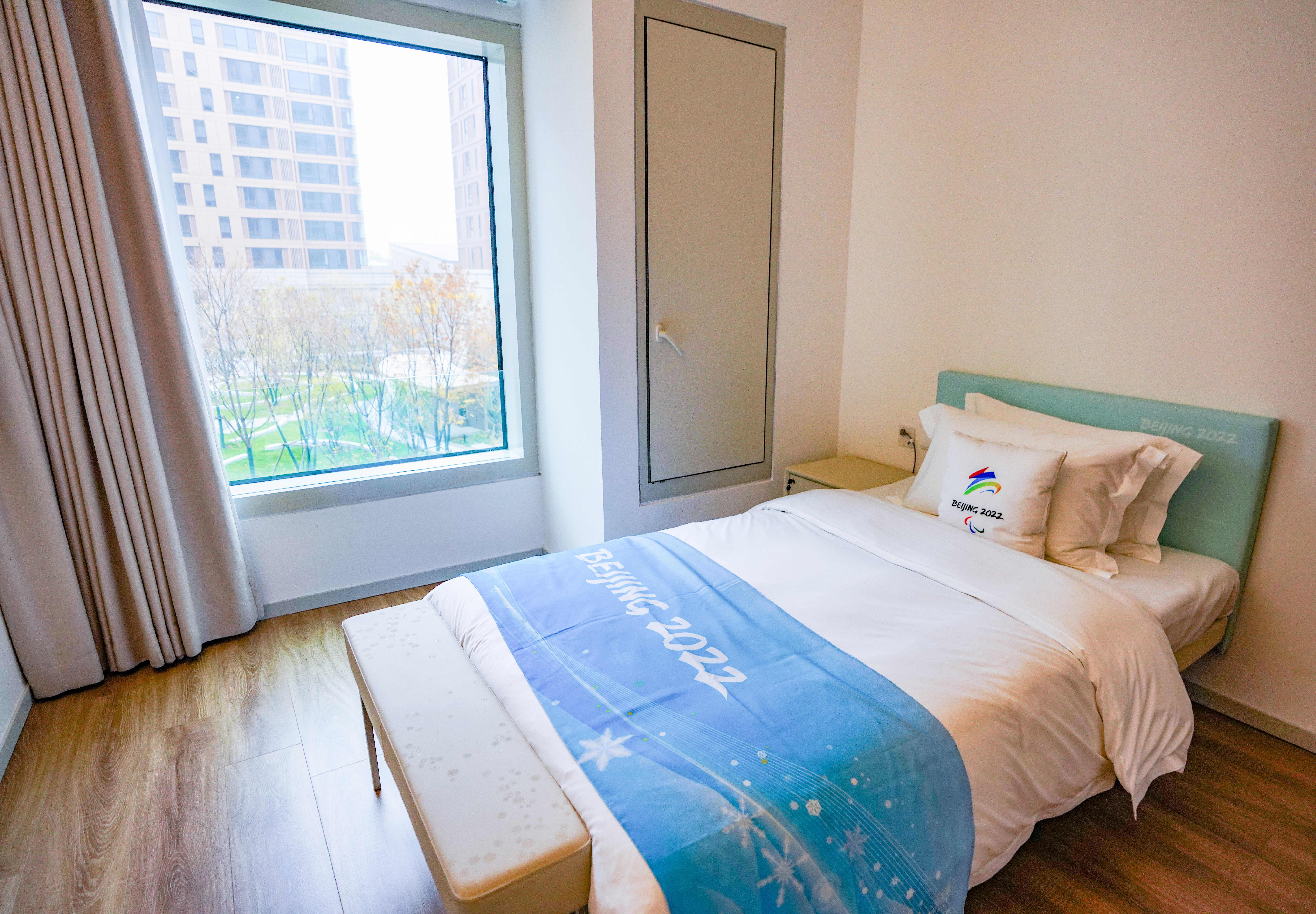 此外,房间处处体现人性化关怀。每间卧室配有床、床头柜、衣柜、衣架、台灯等。冬残奥会启用的公寓楼按钮和插座都是低位设计。紧急按钮设在床头柜上方显眼之处,如遇突发情况可一键呼叫,信息直达中控室。衣柜采用推压式开关门设计,开关自如,使用便捷。