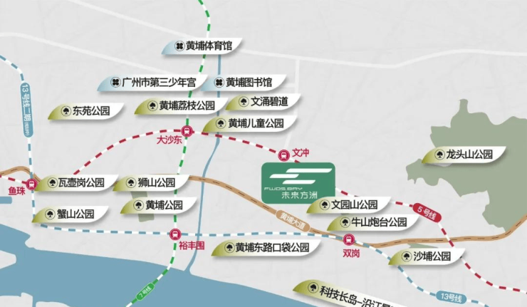 城际交通:广深沿江高速,迅达东莞、深圳;黄埔高铁站(规划中)9站21线,联通大湾区,便捷出行