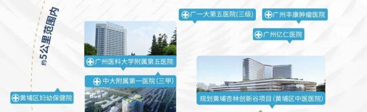 附近几所三甲医院中大附属第一医院(三甲),广医大附属第五医院(三甲)、黄埔区中医医院、广州市黄埔区妇幼保健院等,都在2公里之内。