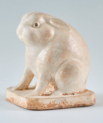 兔蹲踞于八边形台座之上,前肢挺于胸前,昂首前视,双耳后抿,贴于颈背。通体施白釉,台座底部露白胎微泛黄,兔眼点褐彩。巩义黄冶窑窑址曾出土造型相近的素胎残件,结合胎釉特征判断此器当属巩义窑产品。