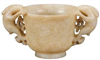 双耳杯一般认为是由古代羽觞发展而来,明代双耳杯继承传统,样式更为丰富。这件白玉双兔耳杯对于兔的形态把握精准,造型生动,左右呼应,工艺精湛。杯身满雕,前后阴刻四爪龙纹,是同类器物中的珍罕之作。