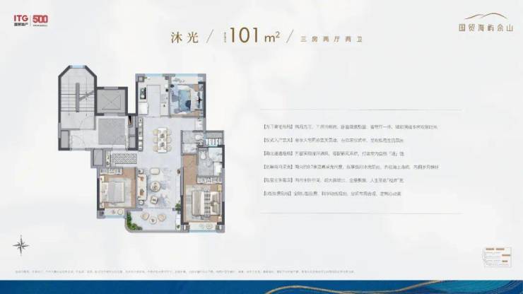 除了叠墅外,全社区仅4幢建面约101㎡沐光全景小高层,通过前瞻排布,几乎做到了户户景观无遮挡。
