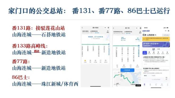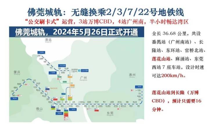 地铁交通:距离项目2.5公里处有莲花山站,佛莞肇城际已经开通运营了,3 站到长隆万博,4 站到广州南站。另外佛莞深城轨琶洲支线还在建设中,(2 站到大学城,3 站到琶洲)以及广中珠澳城轨(规划中)和8号线地铁的东延段(预计2027年通车)。