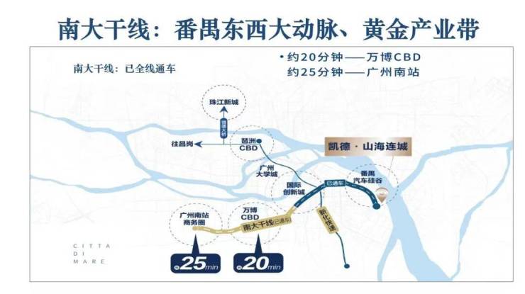 凯德·山海连城位于广州市番禺区金山大道东龙丰路段,楼盘是新加坡凯德集团布局华南板块东,落子广州番禺的山海生态大盘。