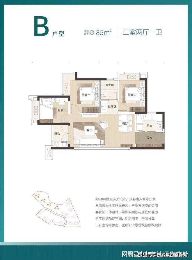 85㎡的3房2厅1卫:设计的是竖厅格局,餐客厅一体化设计,U型厨房,卫生间三段式分离设计,得房率:79.26%(不含赠送),阳台朝西南或东南向。