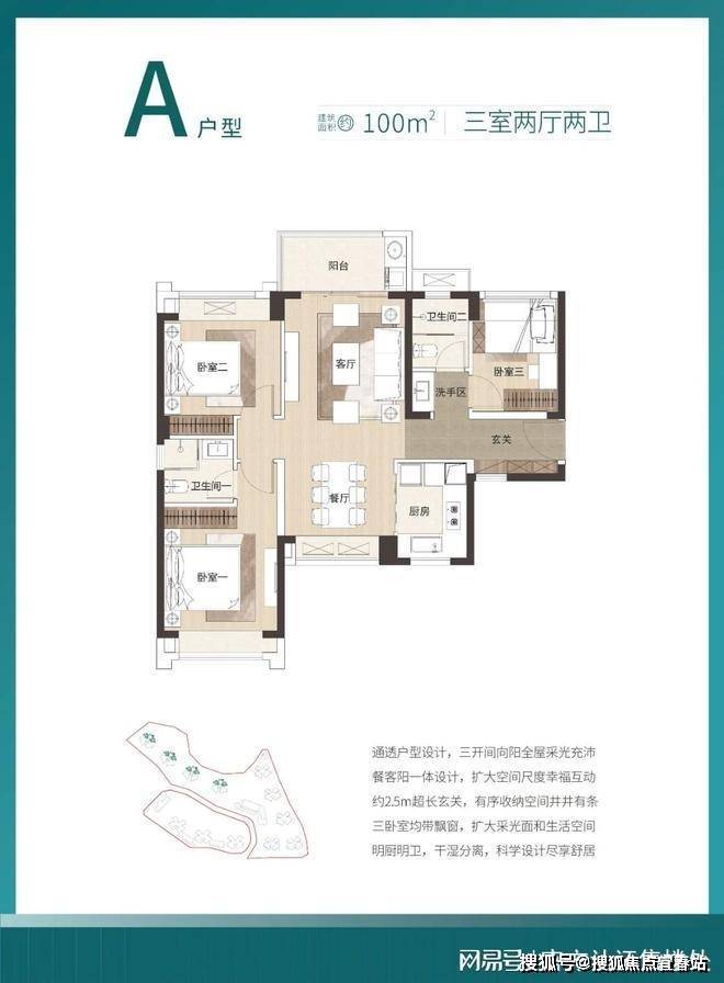 100㎡的3房2厅2卫:设计的是竖厅双龙抱珠格局,餐客厅一体化设计,三开间朝南,U型厨房,公卫三段式分离设计,得房率:79.25%(不含赠送),阳台朝西北或东北向,看山景。