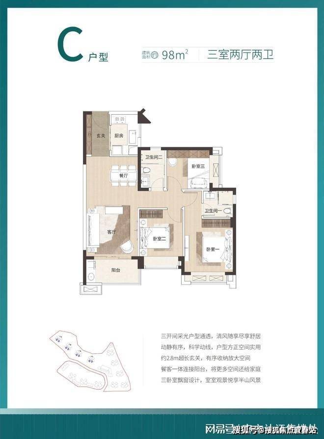 98㎡的3房2厅2卫:设计的是经典竖厅格局,餐客厅一体化设计,三开间朝南,U型厨房,得房率:79.25%(不含赠送),阳台朝西南或东南向。