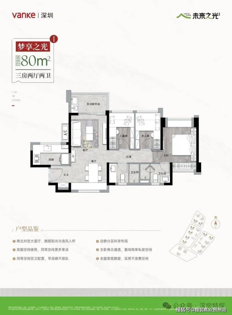 6、户型设计不错,别的开发商80平这个面积段只能做三房一卫,万科做到了三房两卫,功能性立马提升