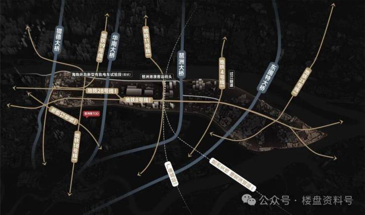 越秀琶洲南TOD项目位广东省广州市海珠区金运路1号,海珠赤沙TOD地块东侧紧挨华南快速干线,北侧隔着黄埔涌,对岸就是高楼林立的电商总部琶洲西区。