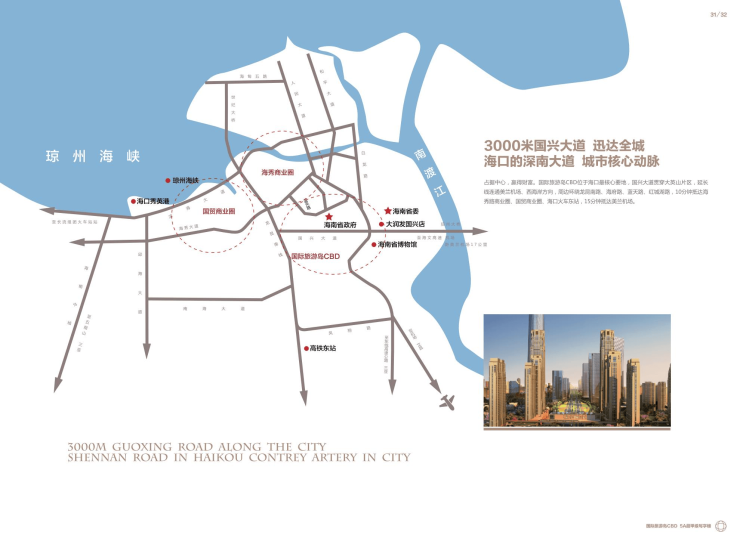 【周边商圈】位处国兴中央商务区,分别以海秀快速路、龙昆南路、蓝天路、海府路等联结西海岸、国贸商圈、解放路商圈、海甸岛商圈,国兴大道延伸线直达江东新区。