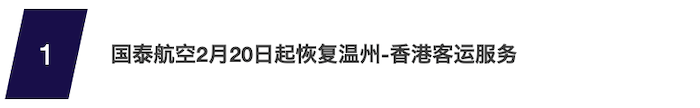 2月20日起,国泰航空将恢复每周三班往来温州与香港的客运航班服务,这将是国泰航空恢复的第十四条内地航线。重新启航的温州与香港客运服务将于每周一、四、五营运,采用空客 A321neo客机执飞。A321neo为国泰航空单通道机队的新成员,配有专为短途航线而设计的崭新公务舱及经济舱座椅,所有客舱亦都配备 4K 超高清个人电视屏幕,为旅客带来焕然一新的飞行享受。目前,旅客搭乘国泰航空前往香港,持有出发前48小时核酸检测阴性证明,并填写相关健康申报,即可享顺畅的“通关”流程。