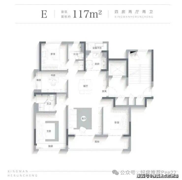 约117㎡户型点评:全明方正通透, 提升空间利用率,LDKB一体,营造大尺度餐客双厅, 亲朋从容相聚,双开间观景阳台, 晾晒之余, 亦可成为兴趣天地,四房功能, 让家庭成长的理想一步到位