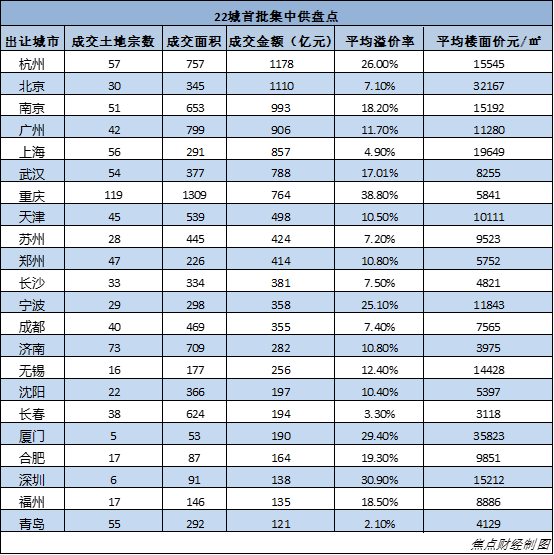 焦点财经统计,22城首轮集中供地总计成交880宗地块,土地成交总额达10703亿元,综合溢价率15.1%。