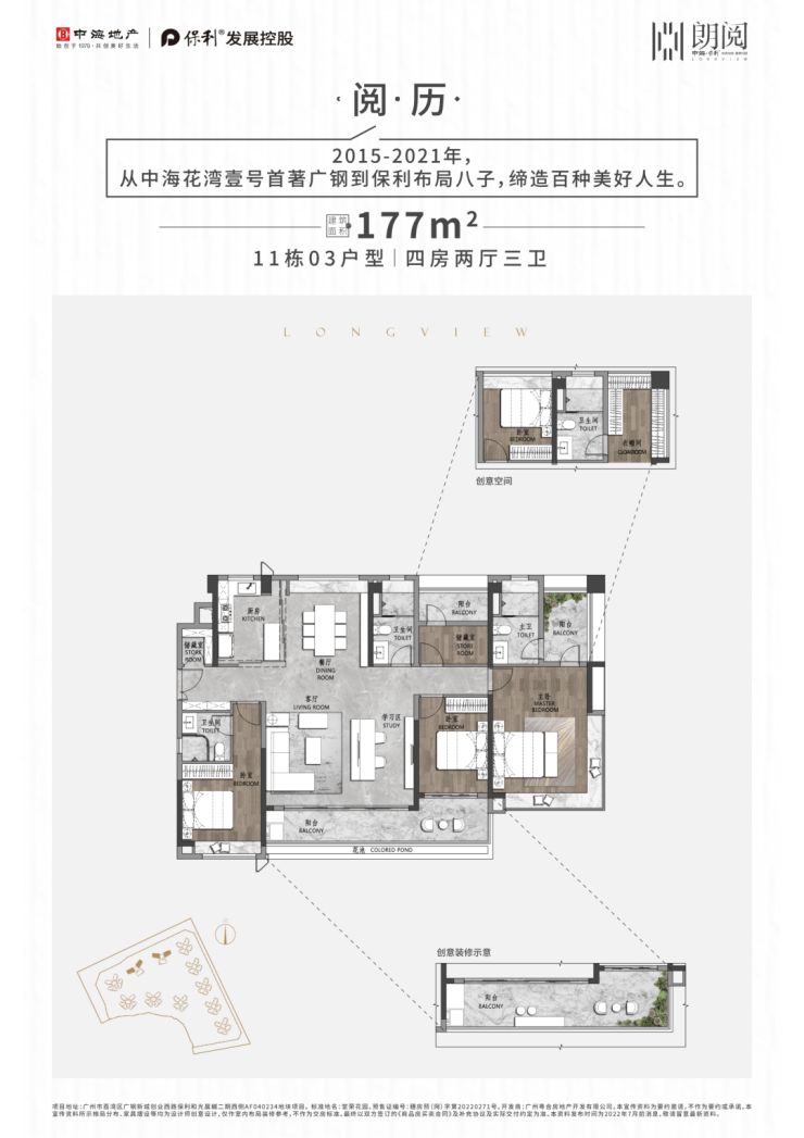 建面约179㎡四房两厅三卫:【尊享归家】独梯独户,归家仪式感慢慢【IMAX尺度阳台】约8.9m观景阳台,中轴岭南式园林景观【双主卧套房】大主套房超30㎡,L型飘窗通透明亮【百变空间】4+1空间,可打造私人酒吧/书吧,实现多元生活。