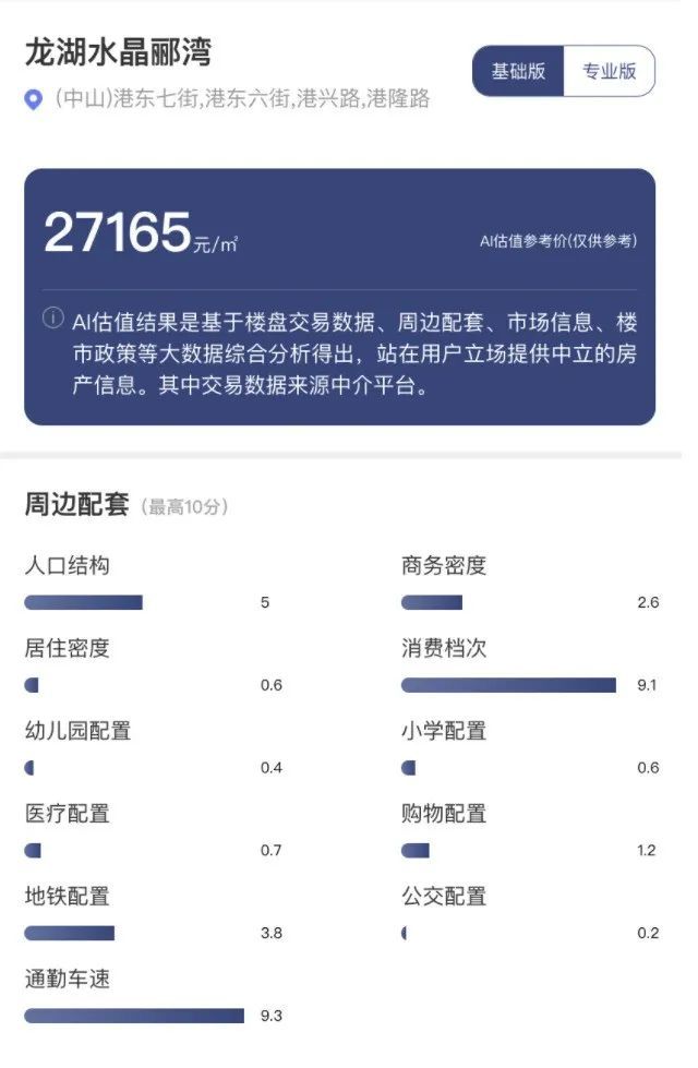 大连市的另一个热盘——位于中山区东港位置的龙湖水晶郦湾,由于地处东港稀缺区位,二手房一向受到买房人追捧。每经AI品房大数据显示,龙湖水晶郦湾当前AI估值参考价为27165元/平方米,该小区通勤车速较北府花园高出不少,为9.3,但公交配置指数仅为0.2。