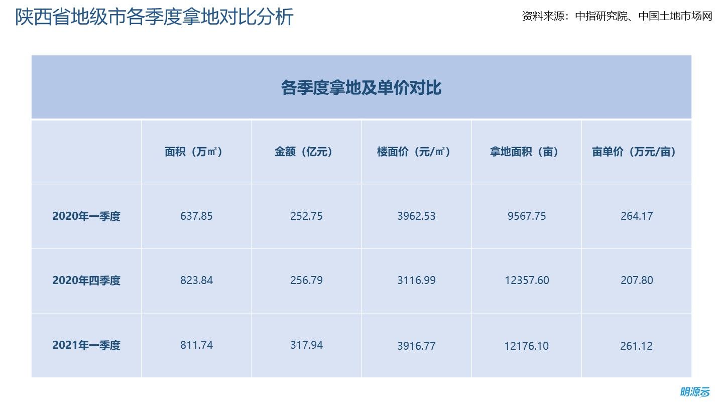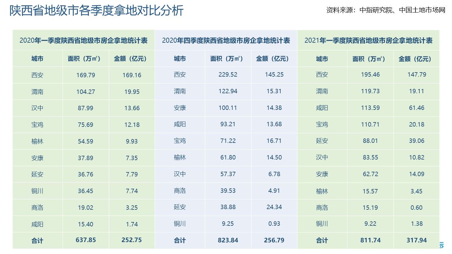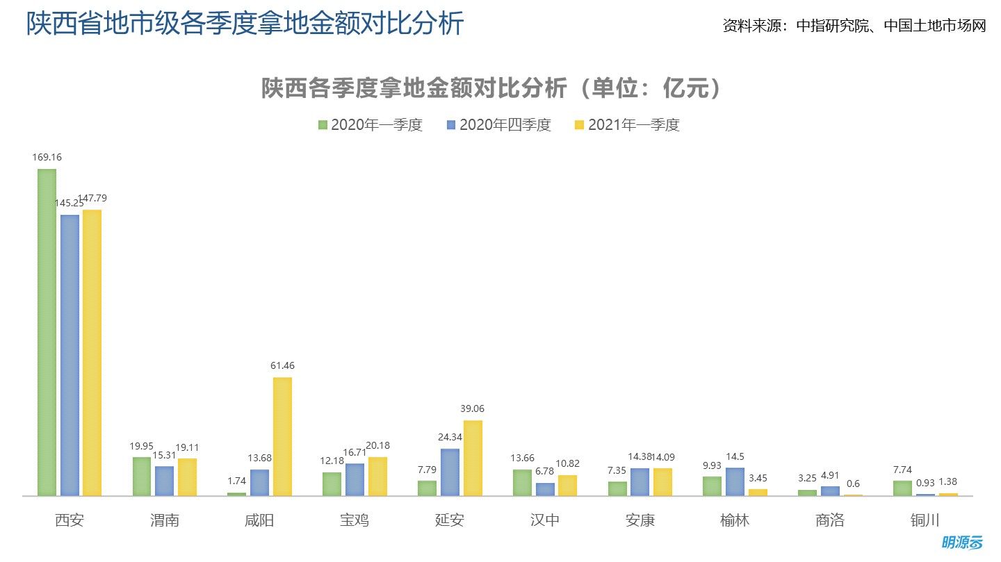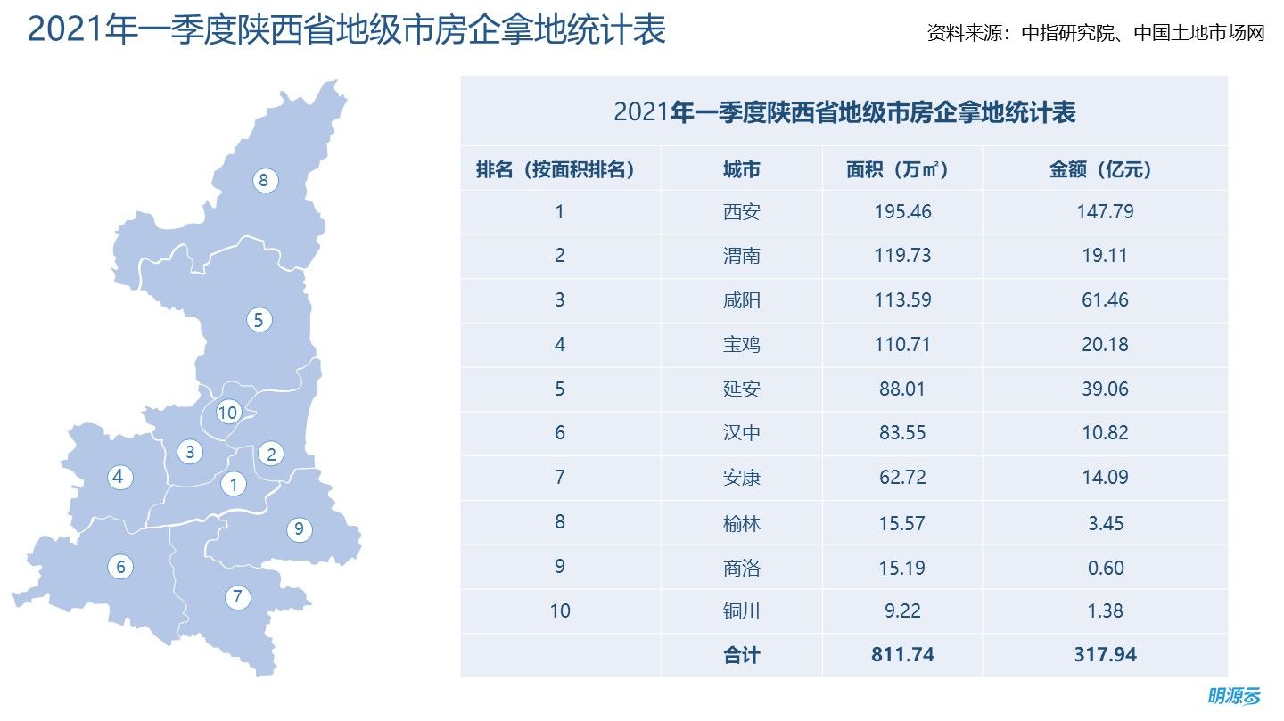 数据摘要 陕西省地市拿地较新数据表明: 据中国土地市场网信息得知,2021年一季度西安房企共拿地195.46万m²,拿地总金额共计147.79亿元。 据中国土地市场网信息得知,2021年一季度渭南房企共拿地119.73万m²,拿地总金额共计19.11亿元。 据中国土地市场网信息得知,2021年一季度
