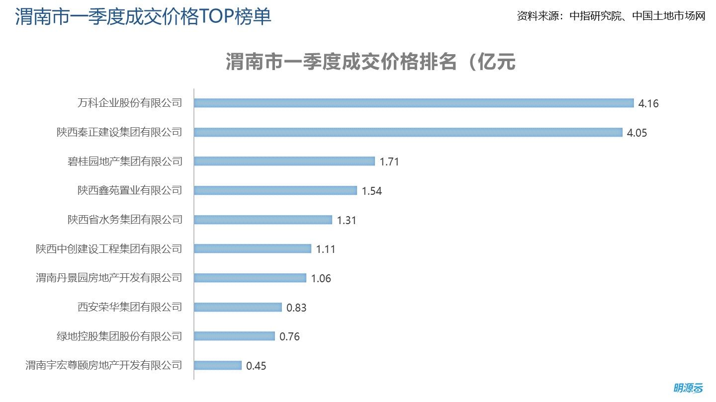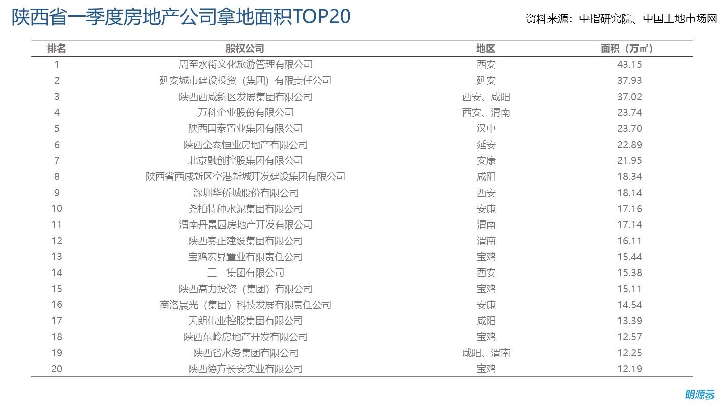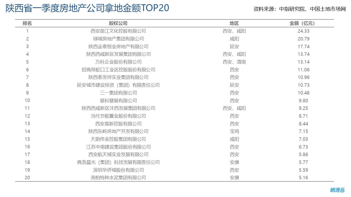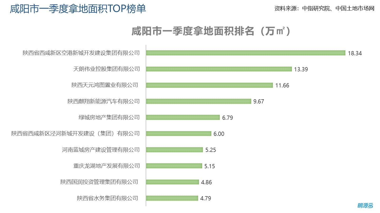 数据摘要 陕西省地市拿地较新数据表明: 据中国土地市场网信息得知,2021年一季度西安房企共拿地195.46万m²,拿地总金额共计147.79亿元。 据中国土地市场网信息得知,2021年一季度渭南房企共拿地119.73万m²,拿地总金额共计19.11亿元。 据中国土地市场网信息得知,2021年一季度