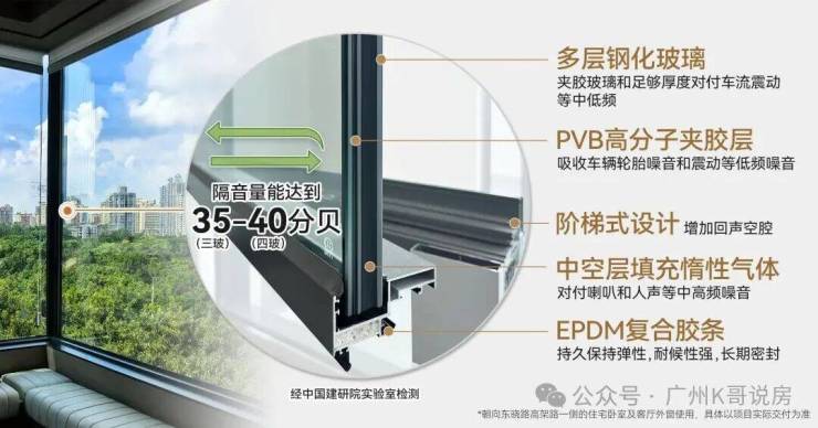 桂悦东晓在窗户之上,也替业主提前考虑到了,全屋配置2-4层中空玻璃(注:3-4层为中空夹胶玻璃)。