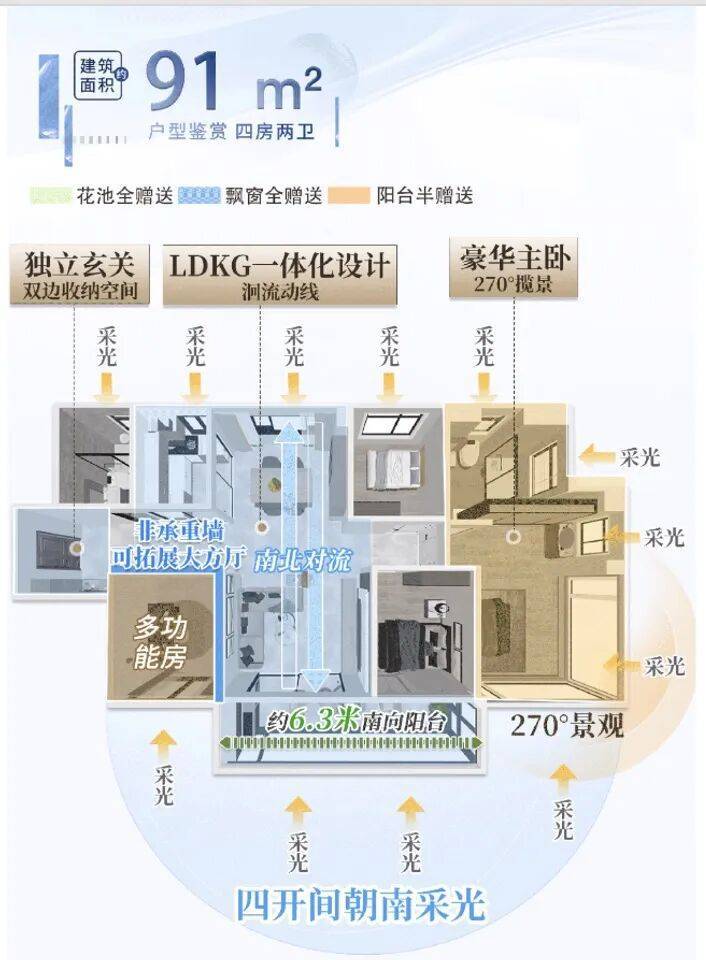 最高约120%使用率,约6.3米南向阳台, 豪华主卧套房+270°环幕全景窗,尺度堪比120平以上的大户型