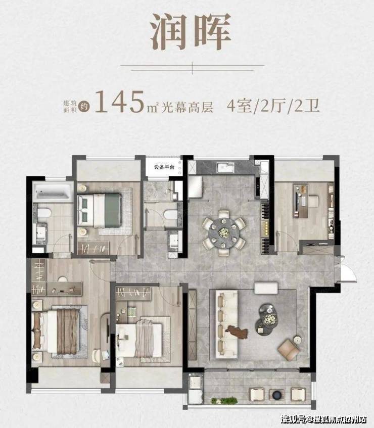 169㎡户型较为方正,双套房,四开间朝南,南向面宽约15.2米。LDKB一体设计,客厅开间约5.2米,双联阳台开间约8.3米。