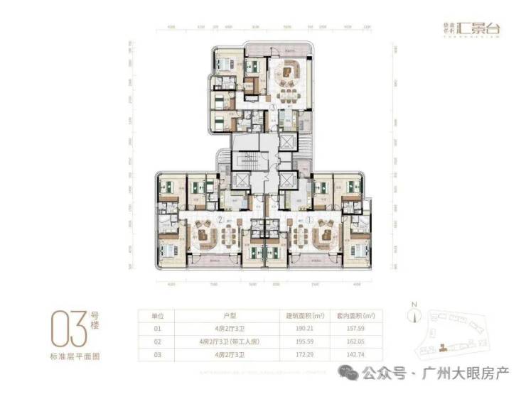 项目由14栋12层小高层组成,产品涵盖123-352㎡三至五房,共8类户型,户型实用率约82-84%