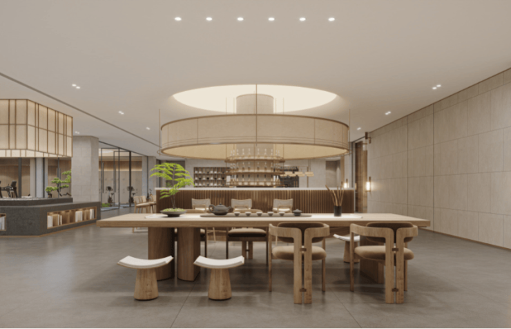 海棠长滩别院缦生活馆秉承“亲生命”理念,将“绿植”、“木”、“石”等天然元素植入空间之中营造亲自然的空间氛围,打造游园般的空间体验。