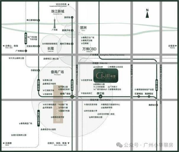 一站即达番禺广场站:地铁3号线、18号线、22号线、3号线东延段(在建中) 、17号线(规划中),五轨交汇,一站畅行琶洲,两站通勤珠江新城。