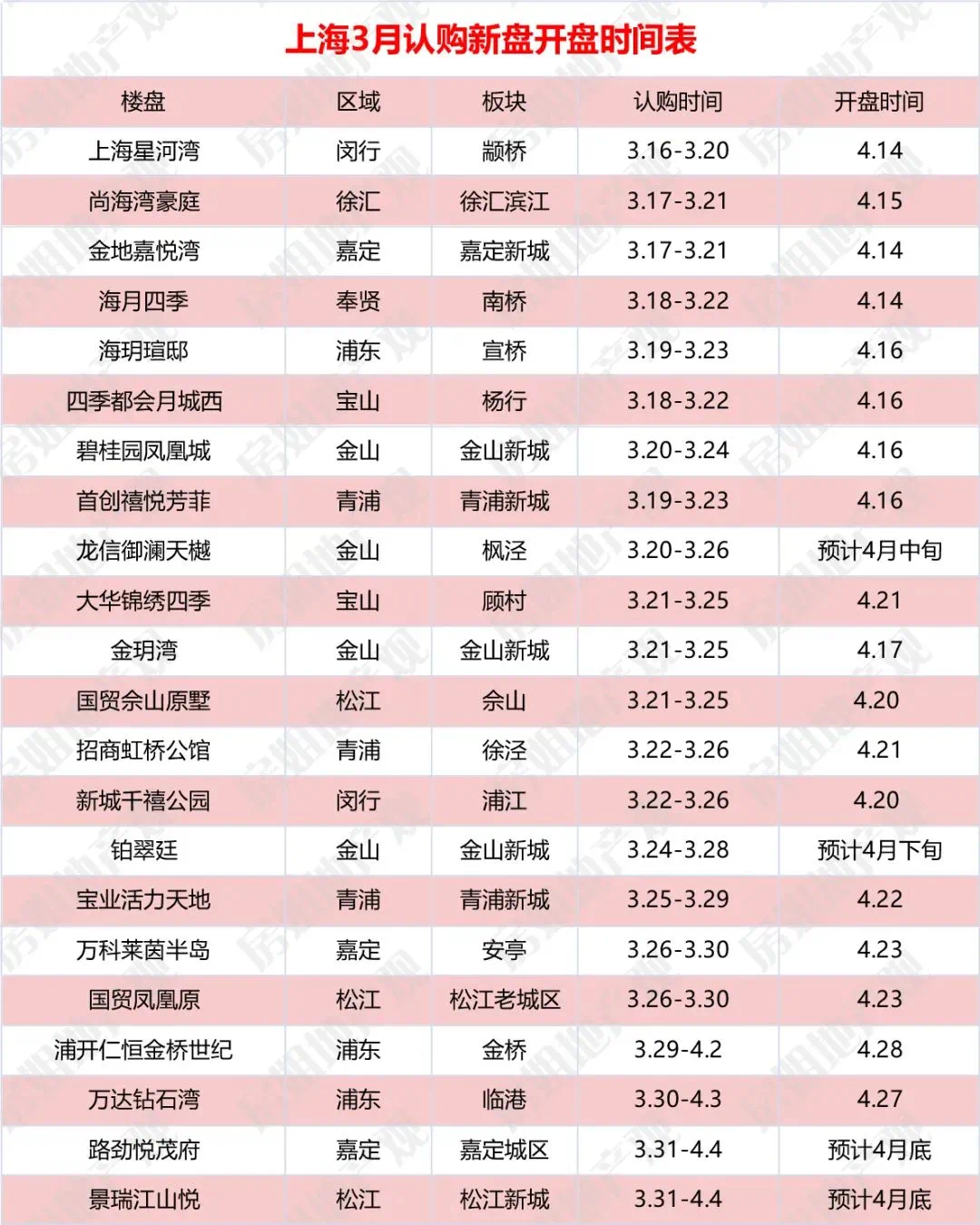 3月上海取证的项目多半已经开启了认购,大部分楼盘将在4月开盘。