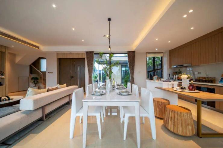 采用全开放式的客饭厅设计,拥有超宽阔的空间感,无论做饭、看电视还是坐着发呆,一家人都能感应彼此的存在。