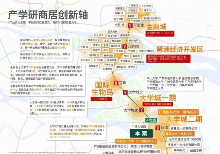 周边有13所高校,从这里出发至万博、琶洲、金融城都非常方便,几大黄金交通线路的开通,使得项目完美实现一步繁华,而且也自带11万方公园,实现了一半公园一半城的社区。