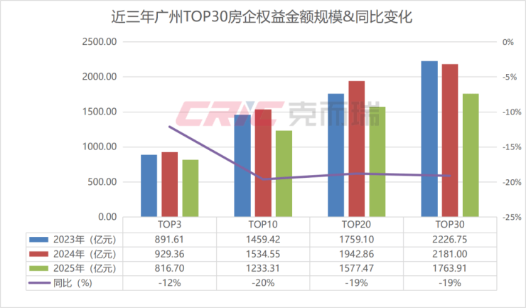 克而瑞数据监测显示,2025年广州权益金额TOP30房企业绩规模1763.91亿元,同比减少19%,TOP20梯队房企业绩规模1577.47亿元,同比减少19%;TOP10梯队房企业绩规模1233.31亿元,同比减少20%,TOP3梯队房企业绩规模816.7亿元,同比减少12%。