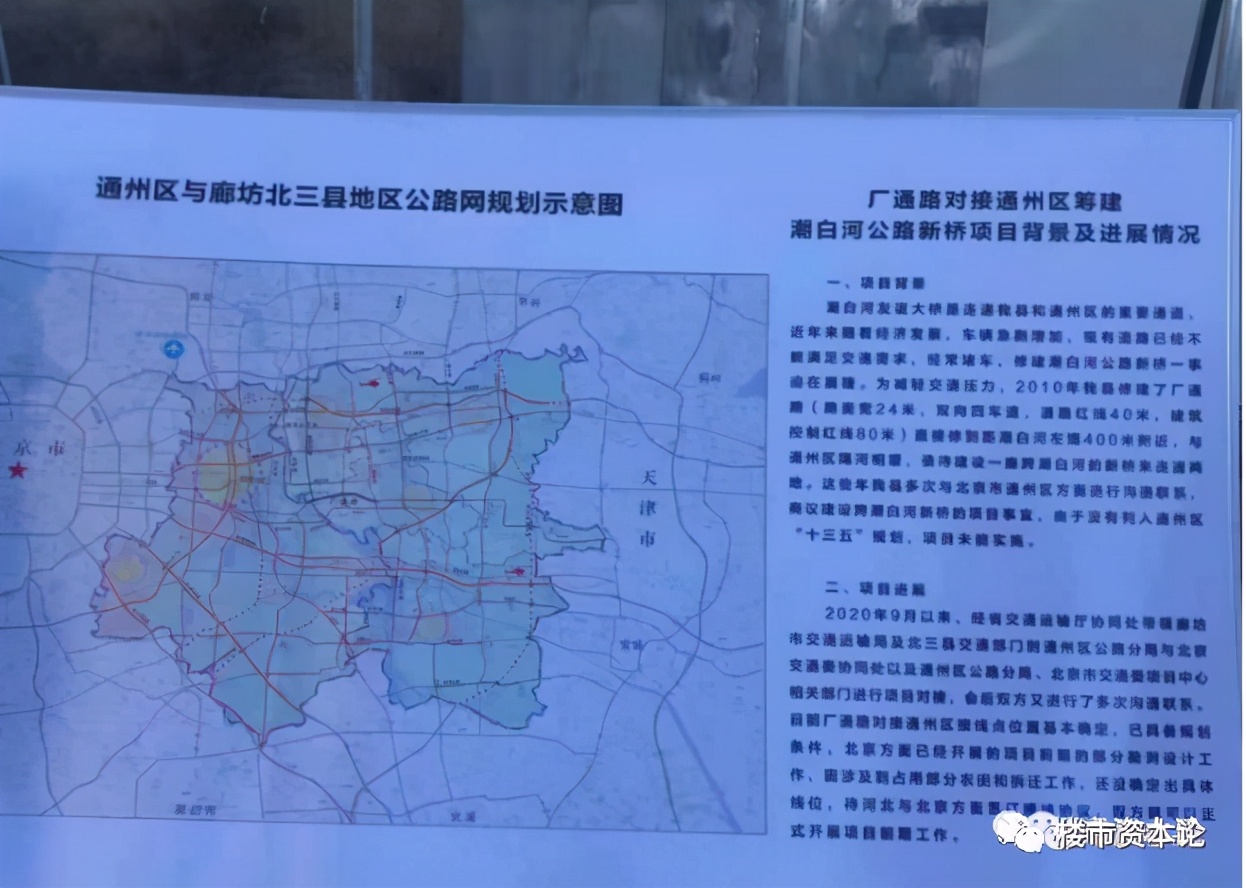 再早前,还流传出一张“通州区与廊坊北三县地区公路网规划示意图”,介绍了潮白河公路新桥项目背景及进展情况。