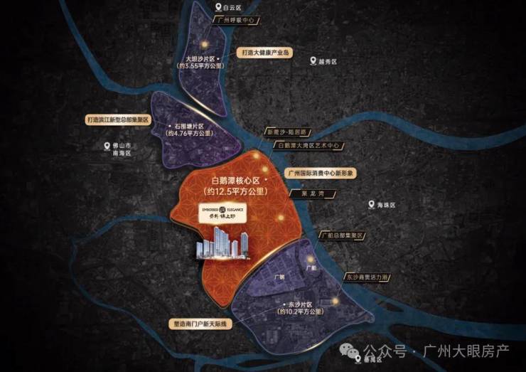 项目傲踞白鹅潭CBD核芯地段,归属于“产-商-居”黄金三极中的花地湾商务组团,先天居住属性优越。