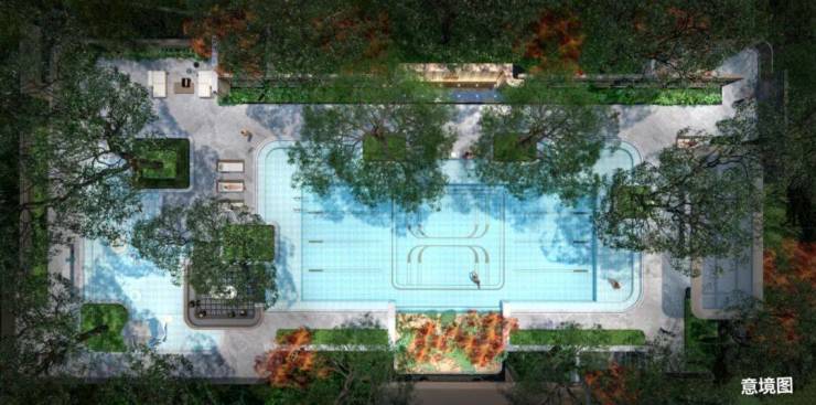 花园泳池:成人、儿童分池玩乐,安心释放玩水天性(成人泳池面积约400㎡,泳道长约30m,儿童泳池面积约120㎡)