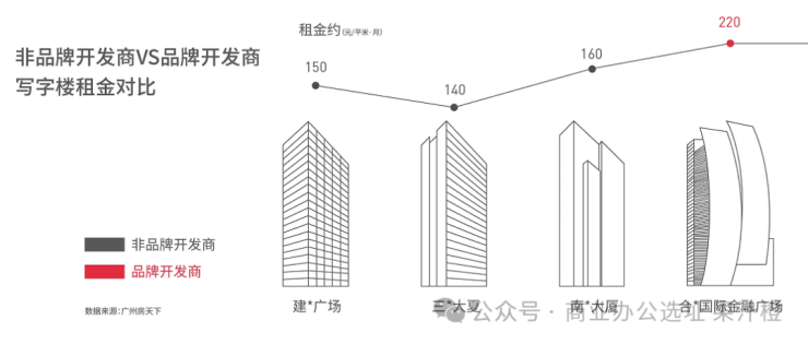 •在广州,品牌开发商写字楼的月租金平均高于非品牌开发商约100元。