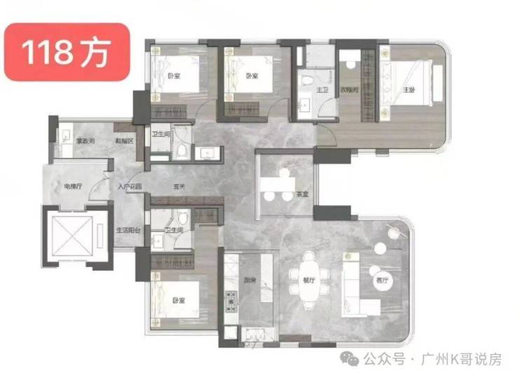·建面约118平的4房,带双主套;