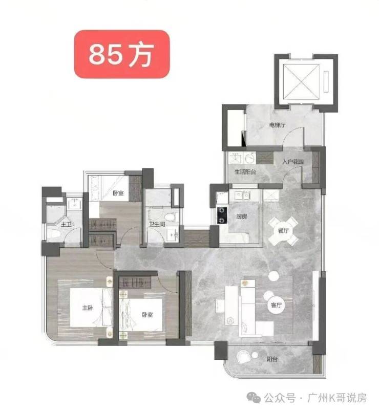 ·建面约85平的3+1房;