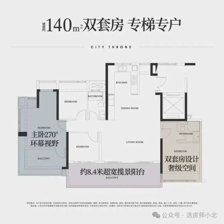 约8.4米南向巨幕阳台,主卧270°飘窗,能最大程度引园景入室。