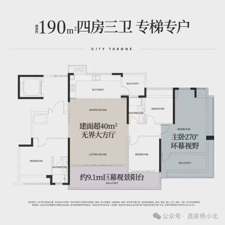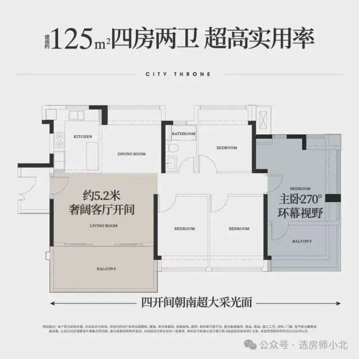 其三,270°飘窗+约8.4米南向巨幕阳台+双南向套房,户型很惊艳这个户型,四开间朝南,也是改善客户的首选。
