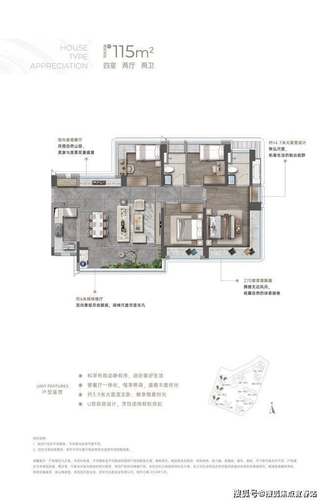 115㎡的4房2厅2卫:横厅南北通透格局,客餐厅6米开间,LDKB一体化,全屋飘窗,4个卧室分别做到了3.9米/3米/2.8米/2.6米的宽度,主卧加1个次卧270°全景飘窗,客厅出6米长的大阳台,L型厨房,得房率约95-97%(包含赠送),西南或东南朝向。